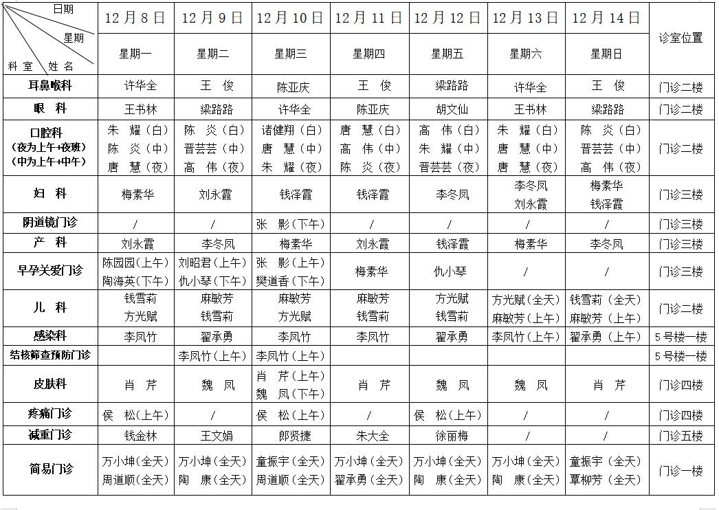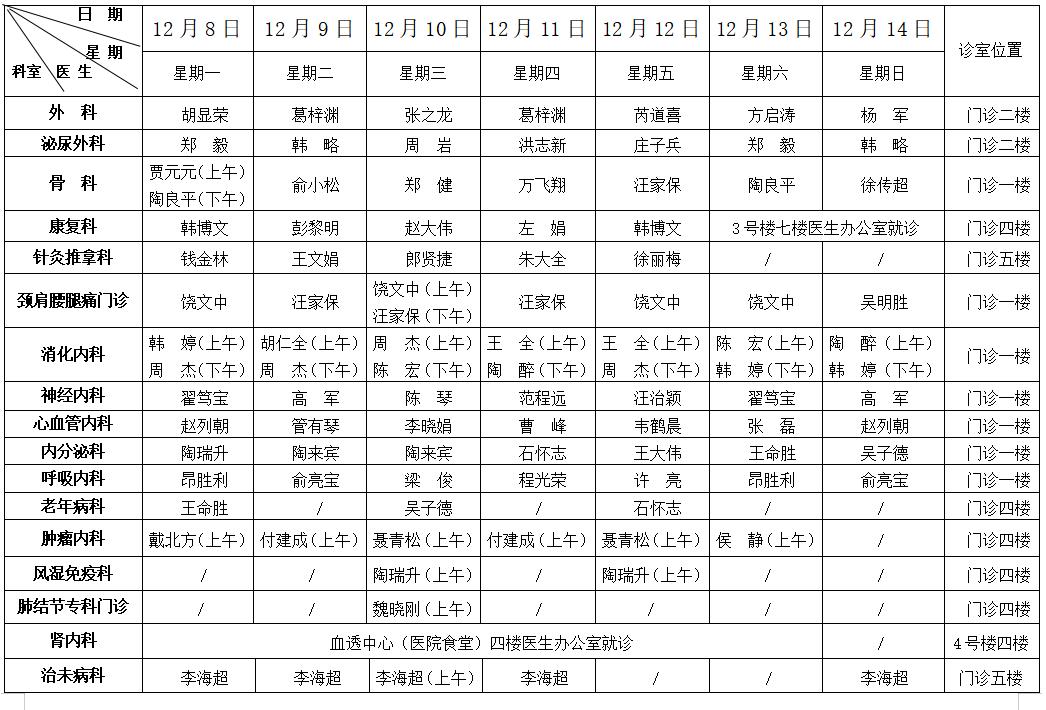 门诊医师排班表(12月8日—12月14日)